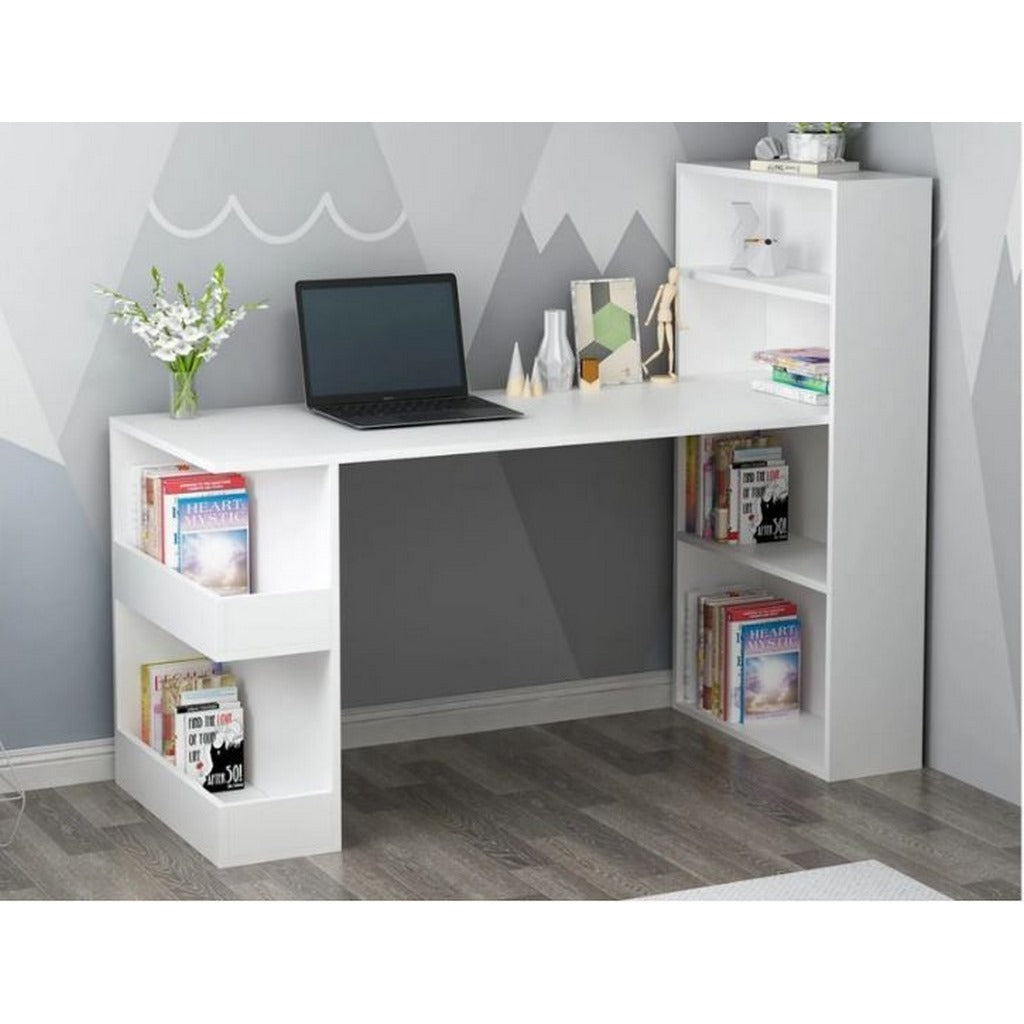 مكتب أبيض أنيق وعملي، مزود برفوف مدمجة متعددة، مثالي لتنظيم الكتب والديكورات ومستلزمات العمل. تصميمه العصري الأنيق يجعله إضافة متعددة الاستخدامات للمكاتب المنزلية وغرف النوم ومساحات الدراسة.