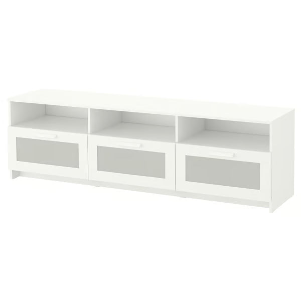 تتميز وحدة التلفزيون هذه بتصميمها المنخفض الذي يتسع لشاشات كبيرة، وتوفر مساحات تخزين مفتوحة ومغلقة موزعة على ثلاثة أقسام. يحتوي كل قسم على رف مفتوح للأجهزة والديكور، بالإضافة إلى خزانة بباب زجاجي في الأسفل لحفظ الوسائط المتعددة بأمان. تضمن المقابض النحيفة المدمجة سهولة الوصول دون التأثير على التصميم الأنيق.