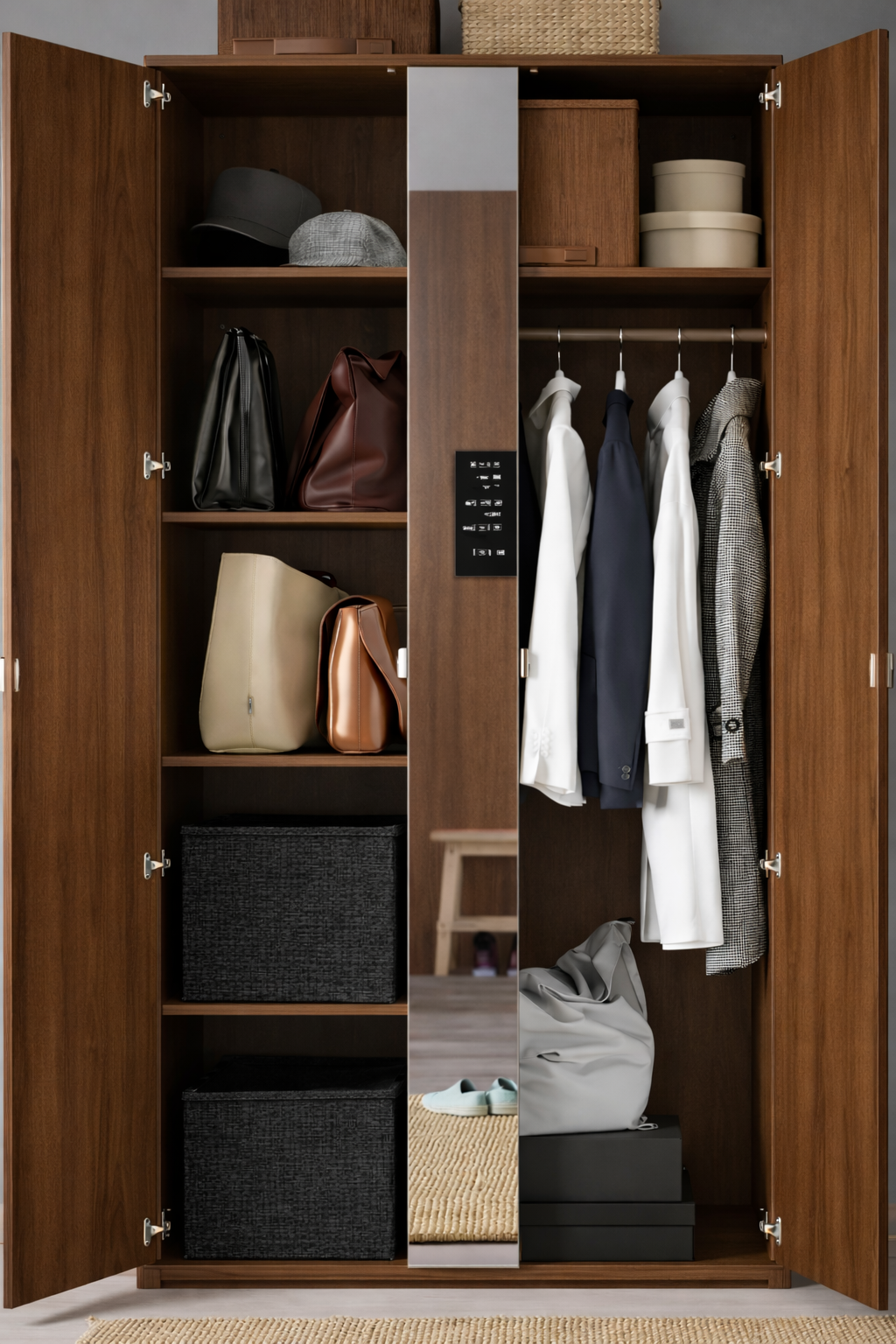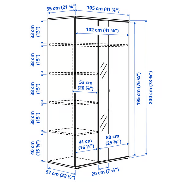 خزانة ملابس أنيقة ببابين وخمسة رفوف ومرآة للتخزين المنظم. مصنوعة من خشب MDF عالي الجودة ، وتأتي مجمعة بالكامل لسهولة الاستخدام.