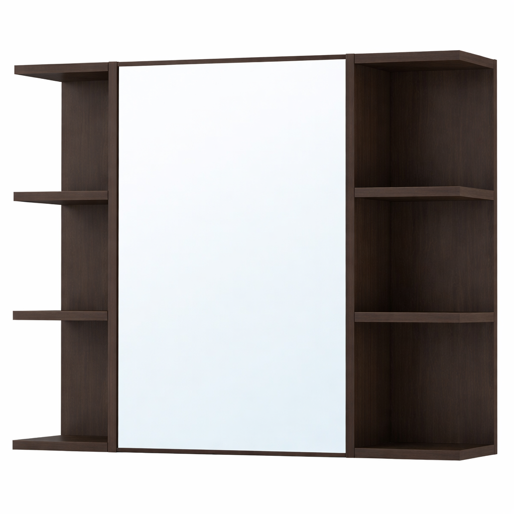 وحدة تخزين حمام أنيقة بواجهة أمامية عريضة بمرآة وأرفف جانبية مفتوحة. تجمع وحدة ليلي ٨٠ سم بين التصميم العصري والعملية، حيث توفر مرآة مركزية كبيرة وستة أرفف مفتوحة لسهولة الوصول إلى مستلزماتك اليومية، مثل مستلزمات العناية الشخصية ومستحضرات التجميل والإكسسوارات.
