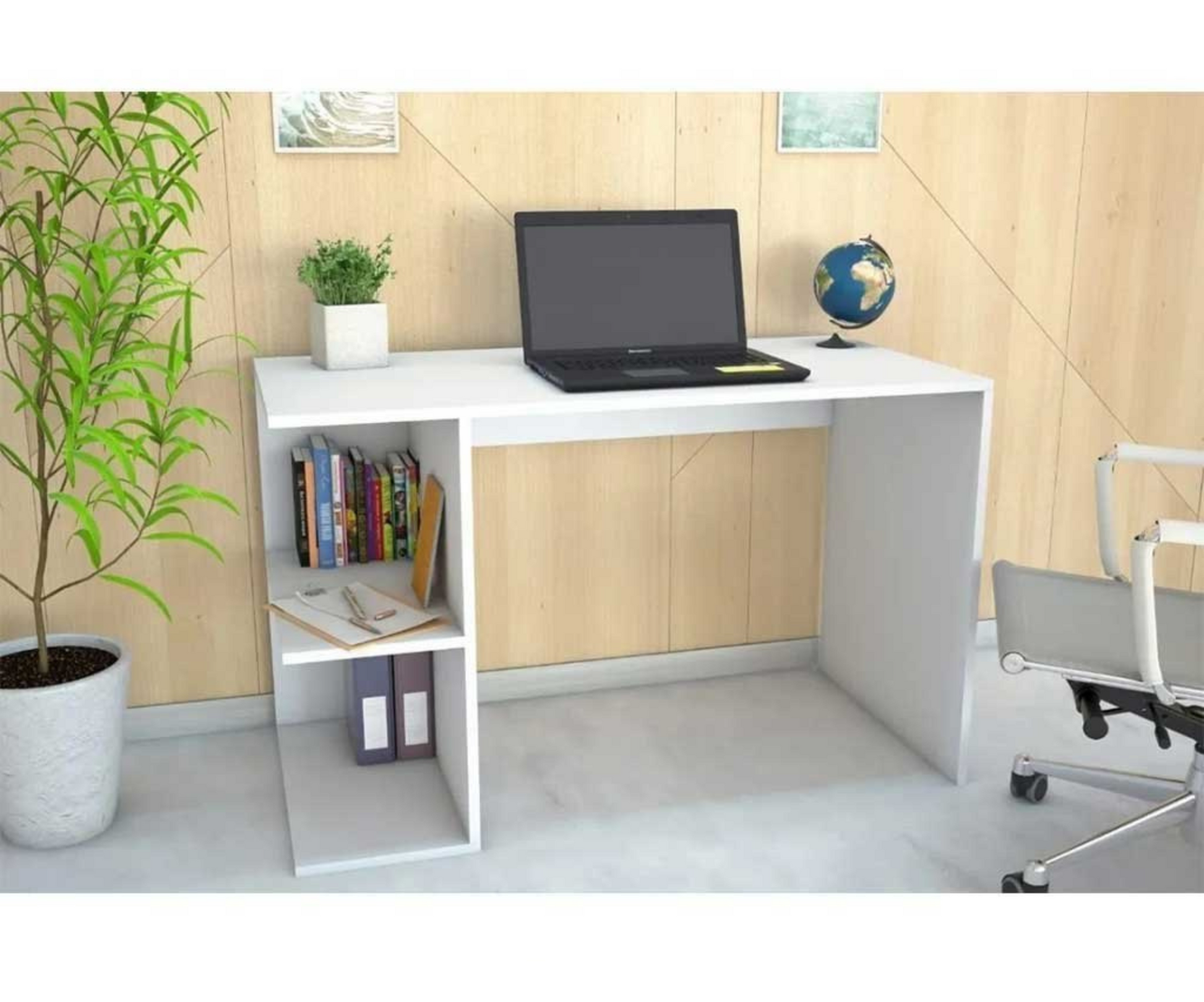 مكتب أبيض بسيط وعملي، مزود بأرفف مفتوحة لسهولة التخزين والتنظيم. تصميمه العصري والأنيق يجعله مثاليًا للمكاتب المنزلية، أو غرف الدراسة، أو المساحات الصغيرة.