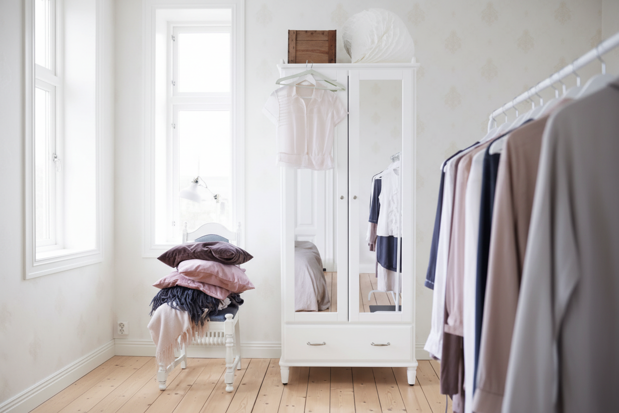 This graceful wardrobe stands tall as a wardrobe essential, featuring full-length mirrored doors that reflect your space and simplify outfit checks. Inside, ample hanging space and shelving keep clothes neatly arranged, with a handy lower drawer for folded items or shoes. Crowned detailing and slender legs lend an air of refined poise to any bedroom corner.