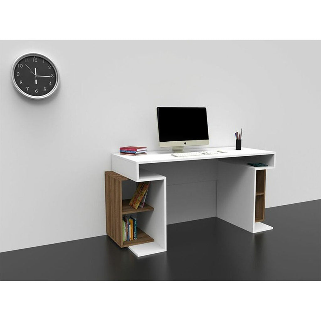 مكتب عصري باللونين الأبيض والبني، مزود برفوف مفتوحة على الجانبين، يوفر مساحة تخزين ذكية ومظهرًا أنيقًا. حجمه الصغير يجعله مثاليًا للمكاتب المنزلية، أو غرف الطلاب، أو المساحات الإبداعية، إذ يجمع بين العملية والتصميم العصري.