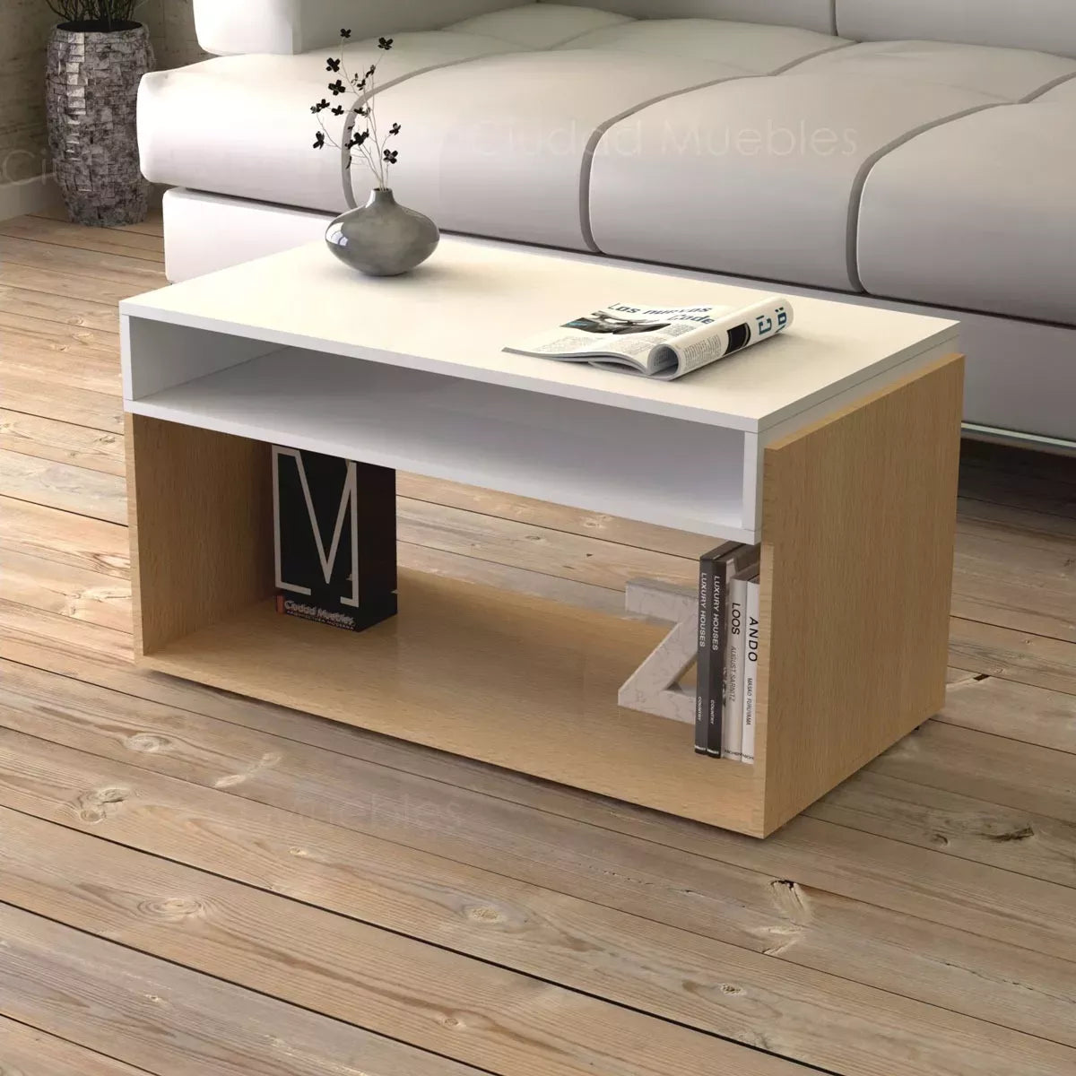 طاولة مركزية زيرا من الخشب الفاتح والأبيض - 70×30×40 سم