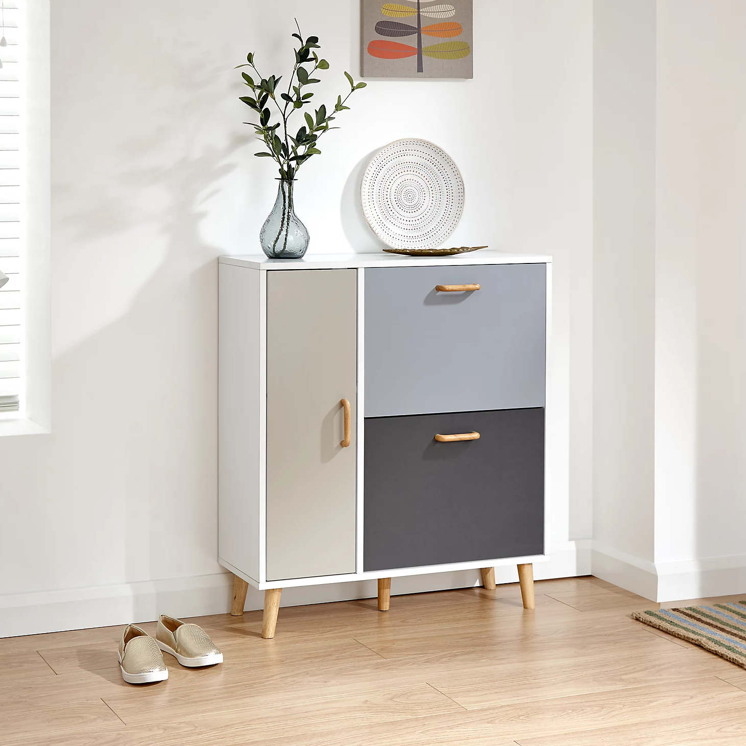 Maximize your hallway's tidiness with this functional and fashionable shoe storage unit. DELTA slim design is perfect for narrow spaces, while still providing ample room for organizing all types of footwear. The sleek white frame is complemented by three different shades of grey panels - a door and two pull-down compartments - giving a contemporary twist to a classic storage piece. Finished with sturdy wooden legs and coordinating handles for a touch of Scandinavian influence.
